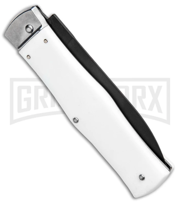 The Mikov automatic knives come from the Czech Republic. This model features white ABS scales and a bayonet-style stainless blade. The Mikov series is well-regarded for their “ready to work” no nonsense design. Each model is built with tough rivet construction. The knife is opened using the small lever near the top of the knife. The lever rests flush in the handle when not in use.