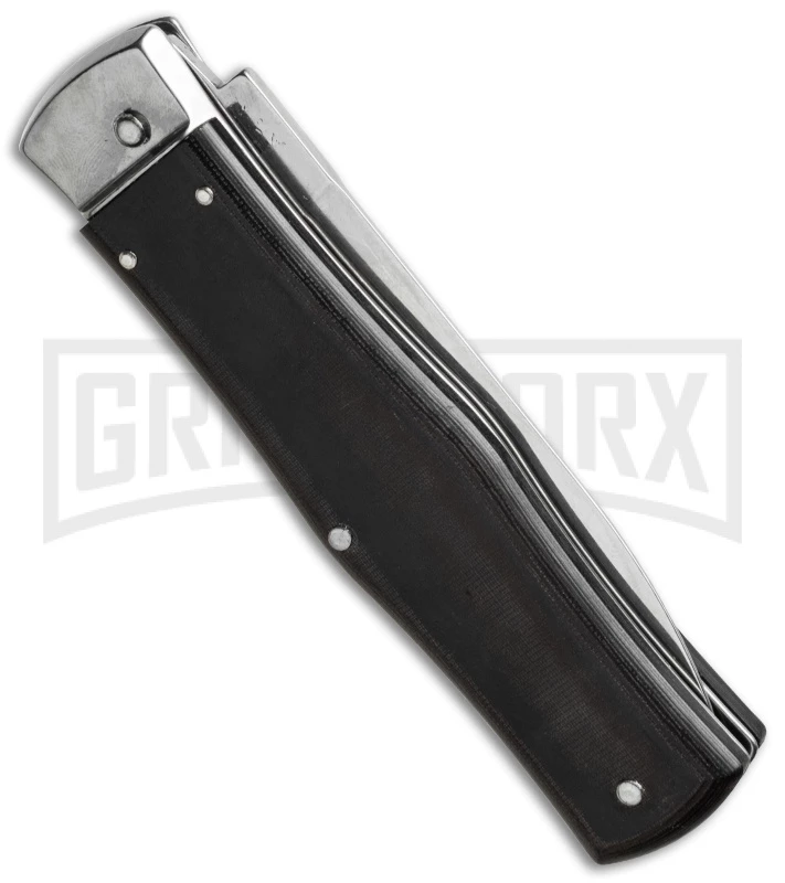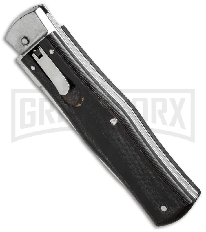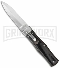The Mikov automatic knives come from the Czech Republic. This model features micarta handle scales and a dagger-style stainless blade (one side is sharp and the other is a false edge). The Mikov series is well-regarded for their “ready to work” no nonsense design. Rivet construction. The knife is opened using the small lever near the top of the knife. The lever rests flush in the handle when not in use.
