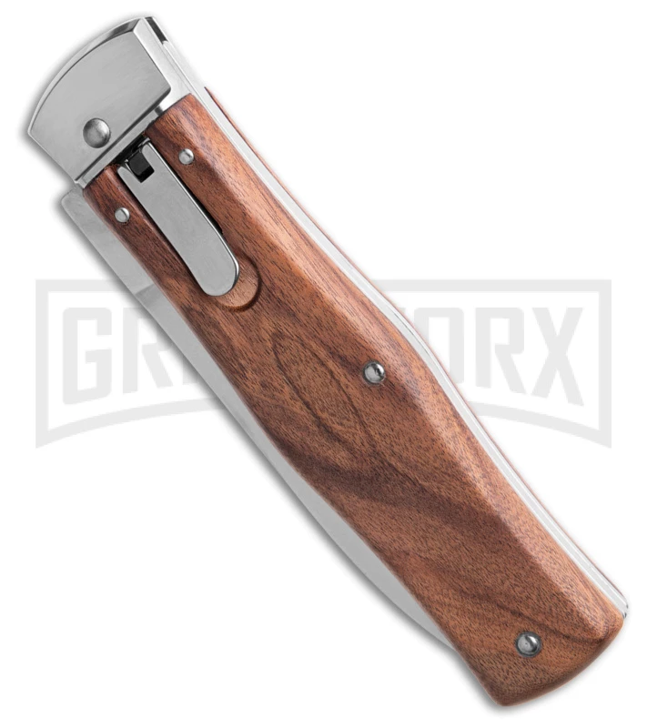 This model features wood scales and a dagger-style stainless blade (one side is sharp and the other is a false edge).